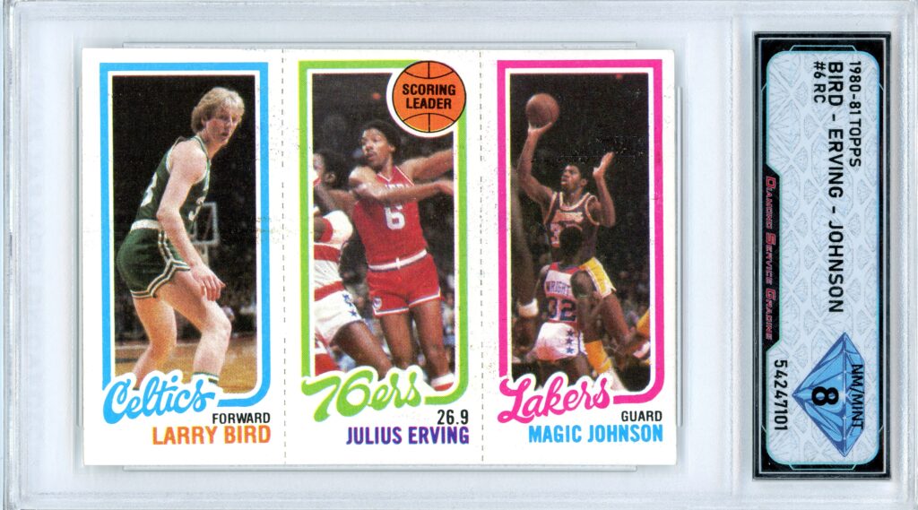 Few basketball rookies are as famous, or as unusual, as the multi-player rookie featuring Larry Bird, Magic Johnson, and Julius Erving. It’s a snapshot of a shifting league: Bird and Magic arriving as the next generation, with Dr. J already establishing the high-flying star power that would define the NBA’s new identity. Bird vs. Magic became the rivalry that propelled the NBA into a new level of mainstream popularity, and Dr. J’s presence on the card ties the era together—three legends on one cardboard stage. That combination of uniqueness, star power, and historical significance makes it one of the most important basketball “rookie” cards in the hobby.