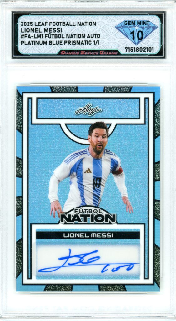 6. 2025 Leaf Football Nation Lionel Messi Futbol Nation Auto Platinum Blue Prismatic 1/1 DSG 10 Gem Mint $3000