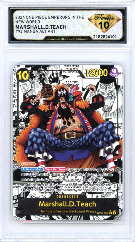 The 2024 One Piece: Emperors in the New World Marshall D. Teach Manga Alternate Art captures one of the most imposing figures in the One Piece universe at full intensity. As Blackbeard continues to rise as a central force in the story, cards featuring him, especially at the Manga Alt Art level, carry significant weight among collectors. Manga rares represent the pinnacle of One Piece TCG chase cards, known for their full-panel artwork and extremely limited pull rates. Each release becomes an instant centerpiece, and Blackbeard’s presence in this format only amplifies its demand. Dark, detailed, and instantly recognizable, this is a card that stands at the top of the set. Graded DSG FLAWLESS 10, this example reaches the absolute highest standard, perfect across every category, with no imperfections to note. Cards at this level are exceptionally rare, elevating an already elite chase into true top-tier territory.