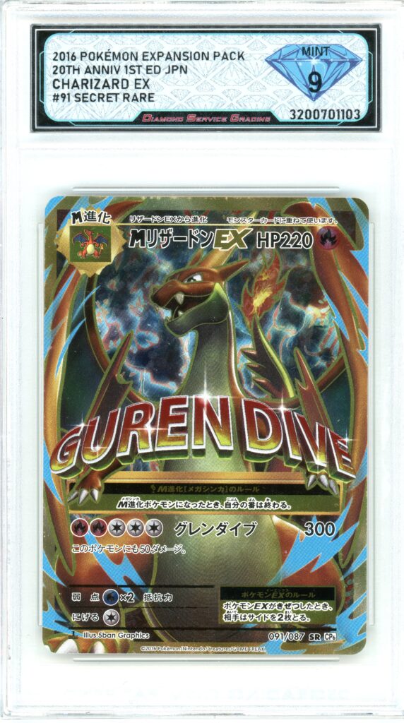The 2016 Pokémon 20th Anniversary Expansion Pack 1st Edition Charizard EX Secret Rare (JPN) is a modern tribute to one of the most important cards in the hobby. Drawing clear inspiration from the original Base Set artwork, it taps directly into the nostalgia that continues to drive Charizard’s demand. Anniversary releases like this carry extra weight, especially when paired with a Secret Rare finish and 1st Edition designation. It’s a combination that connects past and present, something collectors consistently look for. Graded DSG MINT 9, this example maintains strong overall eye appeal on a card that continues to see steady interest from Charizard collectors.