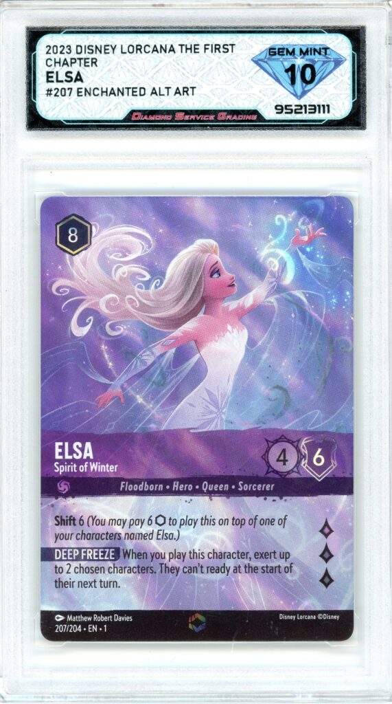 The 2023 Disney Lorcana The First Chapter Elsa Enchanted Alt Art is one of the defining cards from the set. Elsa was the clear standout from day one, and the Enchanted Alt Art version quickly became one of the most sought-after pulls. With its unique artwork and limited pull rate, it sits firmly at the top of the Lorcana chase. As part of the game’s debut release, it also carries that first-set significance, which adds another layer of long-term appeal. Graded DSG GEM MINT 10, this example delivers the condition collectors are looking for on one of the most recognizable Lorcana cards.