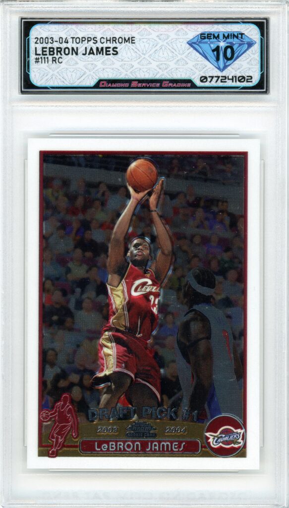The 2003-04 LeBron James Topps Chrome Rookie is exactly what you think it is: one of the biggest cards in basketball. LeBron entered the league with unmatched hype and went on to deliver on all of it. Rookie cards like this remain at the center of basketball collecting because of that legacy. LeBron’s impact on the game, combined with the strength of the Topps Chrome brand, keeps this card consistently in demand. It’s one of those pieces that anchors collections. Graded DSG GEM MINT 10, this example represents the highest level of condition on a card that already holds long-term significance.