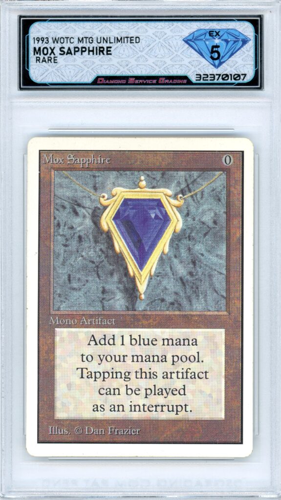 The 1993 Magic: The Gathering Unlimited Mox Sapphire is one of the most important cards in the entire game. As part of the original Power Nine, it represents the earliest era of Magic, where the foundation of the game, and the hobby, was built. Cards like this have remained at the center of collecting since the beginning. Unlimited copies offer a balance between accessibility and history, giving collectors a way to own a true cornerstone piece from the game’s earliest printings. Graded DSG EX 5, this example shows solid overall condition for a card of this age, offering a strong piece of Magic’s history.