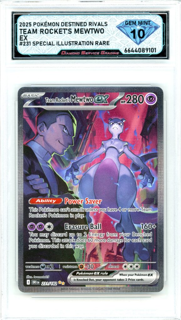 The 2025 Pokémon Destined Rivals Team Rocket’s Mewtwo EX SIR stands out as one of the defining cards from the set. Mewtwo has always been one of the most collected Pokémon, and the Team Rocket version adds a different level of appeal that sets it apart from standard releases. It sits firmly in the top chase tier, a top-tier hit collectors are hunting. Graded DSG GEM MINT 10, this example delivers top-tier condition on one of the most in-demand cards in the set.